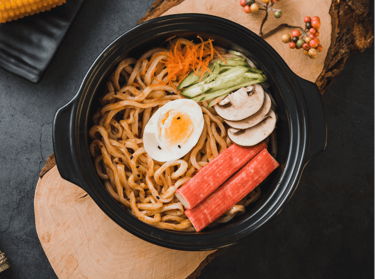 Nosso ramen personalizado vem com macarrão feito à mão, uma grande variedade de coberturas para escolher e caldo caseiro.